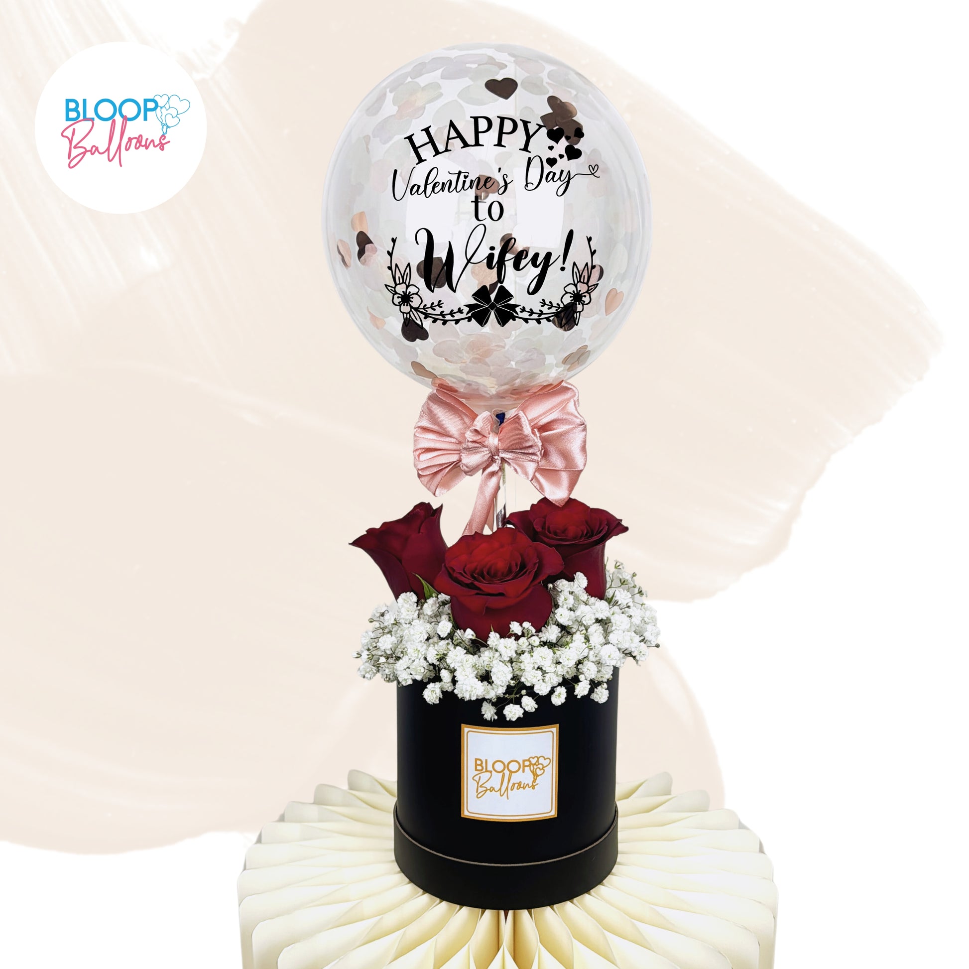 Express your love with this sweet and simple small flower box featuring 3 roses and baby’s breath, paired with a personalised balloon message.